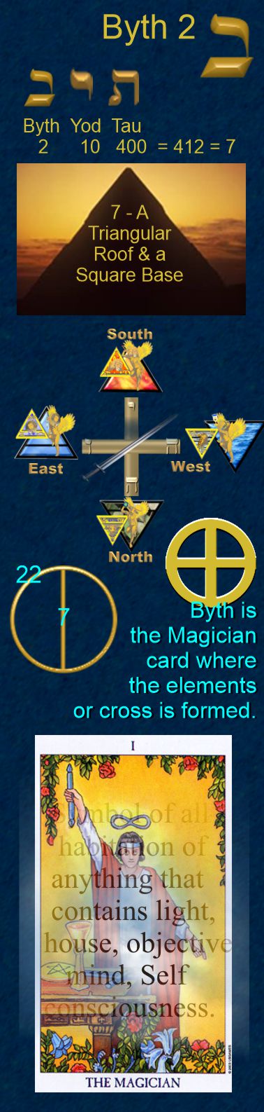 The first letter of the first word of Genesis is Byth, Bereshith = in the beginning. Byth 2 is given the totem of a house or habitation, which is not lost in the creation story of Earth. God’s kingdom is a habitation for life as we know it. The letter Byth 2 is the card of the Magician, having the elemental weapons upon the table suggesting he builds things in an occult manner.